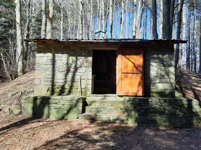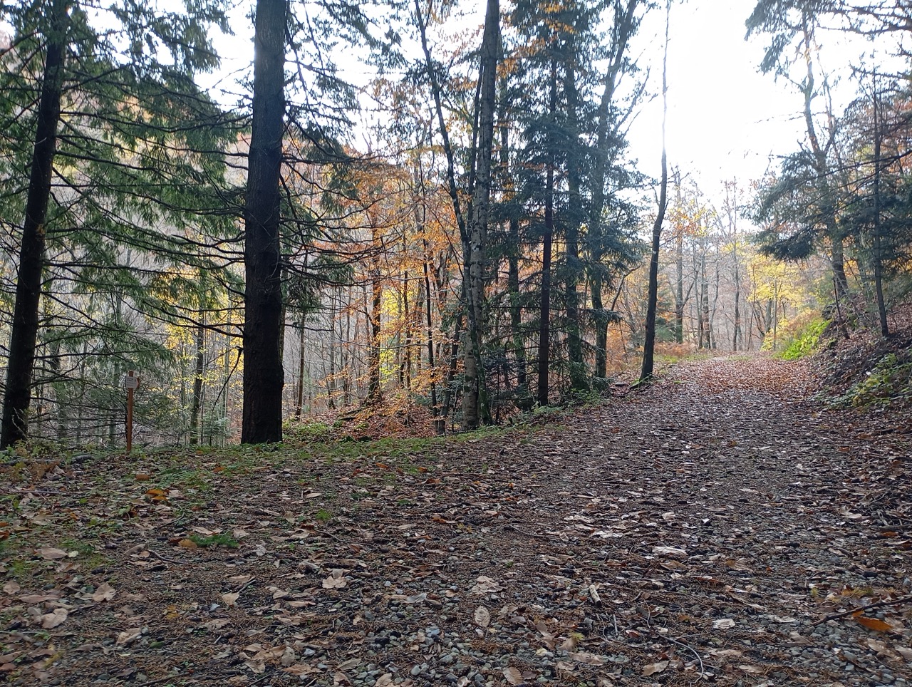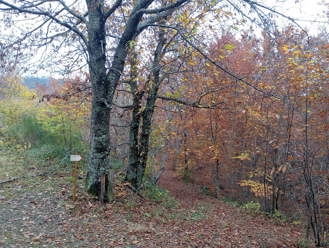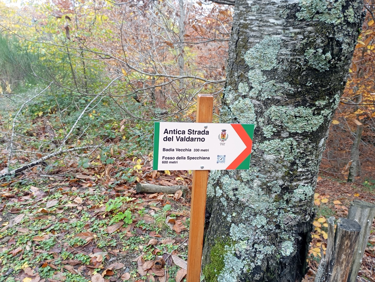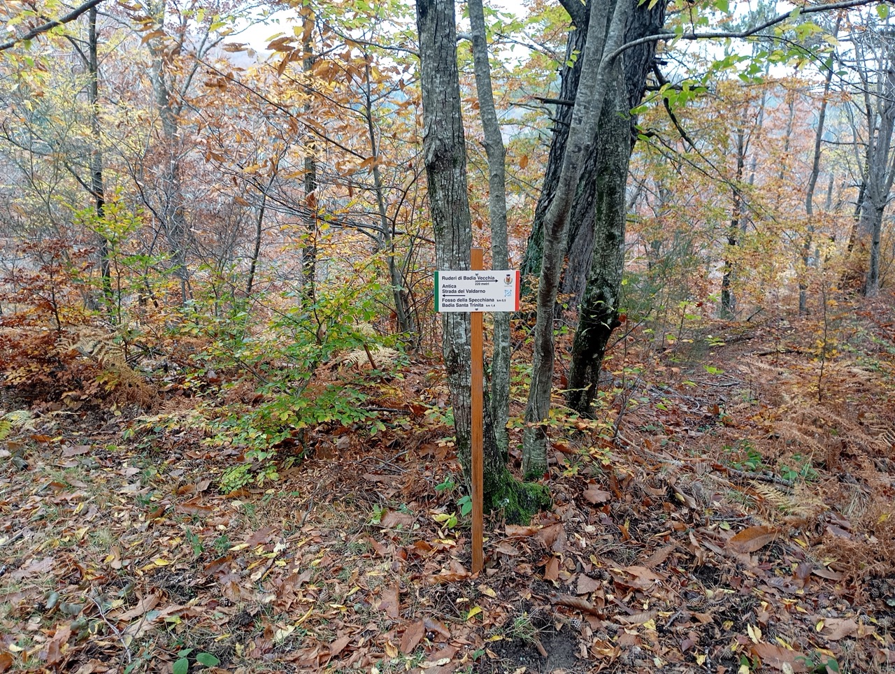 Il sentiero CAI oltrepassa il Campeggio, e continua in discesa fin verso direttamente alla Badia di S. Trinita, ma per variare un pò, dopo meno di 1.5 km prendiamo una deviazione a destra, dove un piccolo cartello segnala una vecchia strada che scende al fosso della Specchiana.