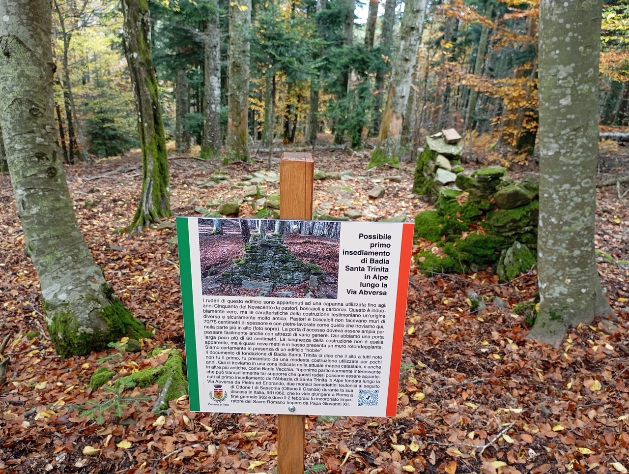 Il manoscritto che parla della fondazione di Santa Trinita narra che l’attuale sito non fu quello che vide l’origine dell’abbazia. È lecito supporre, quindi, che in questa zona sia sorto il primo insediamento monastico, come segnalato anche da un cartello.