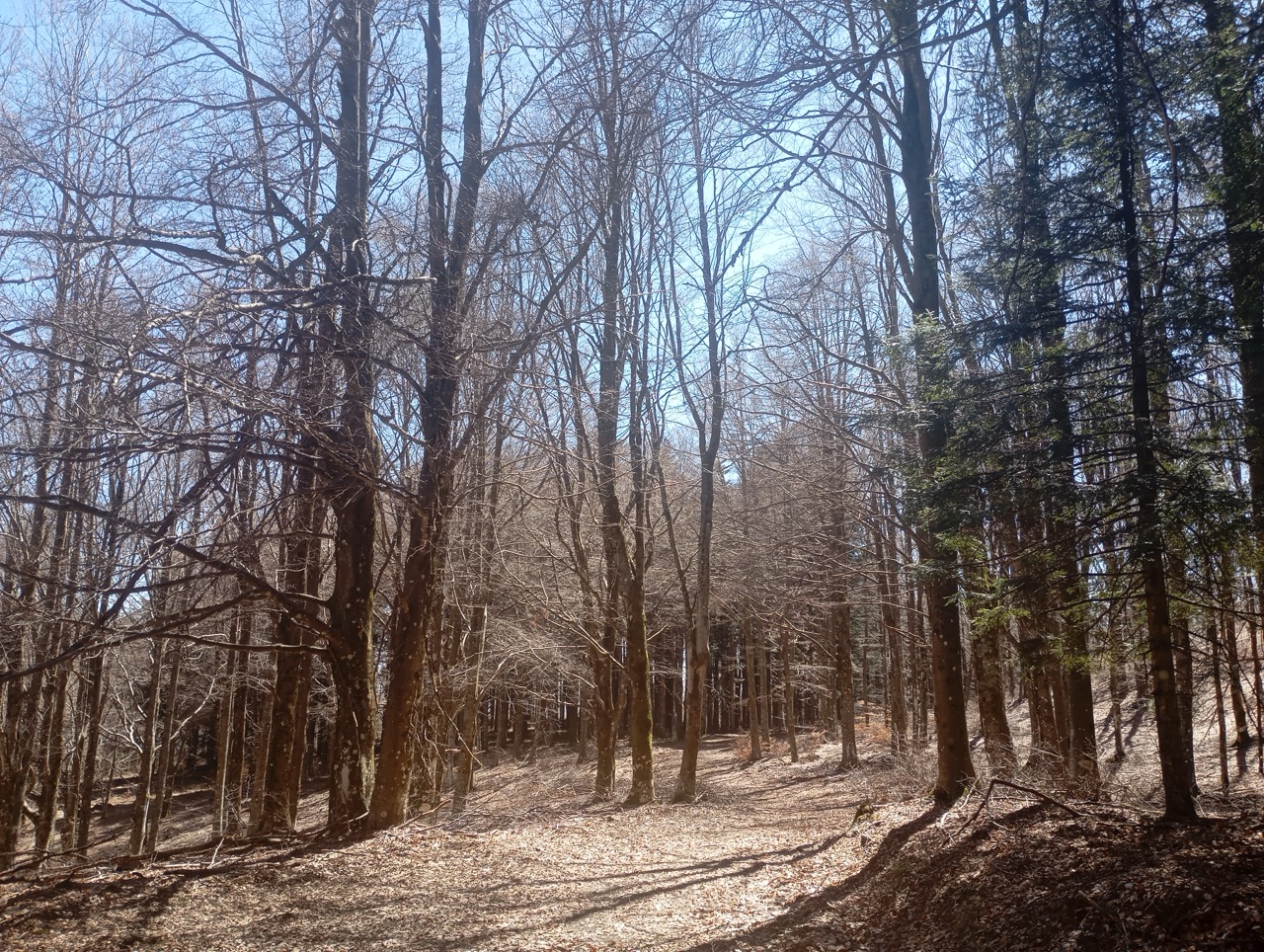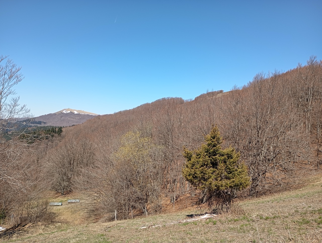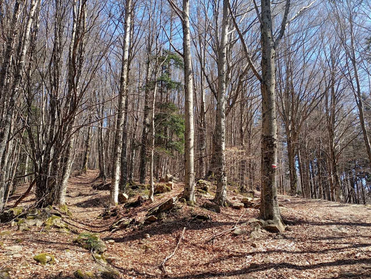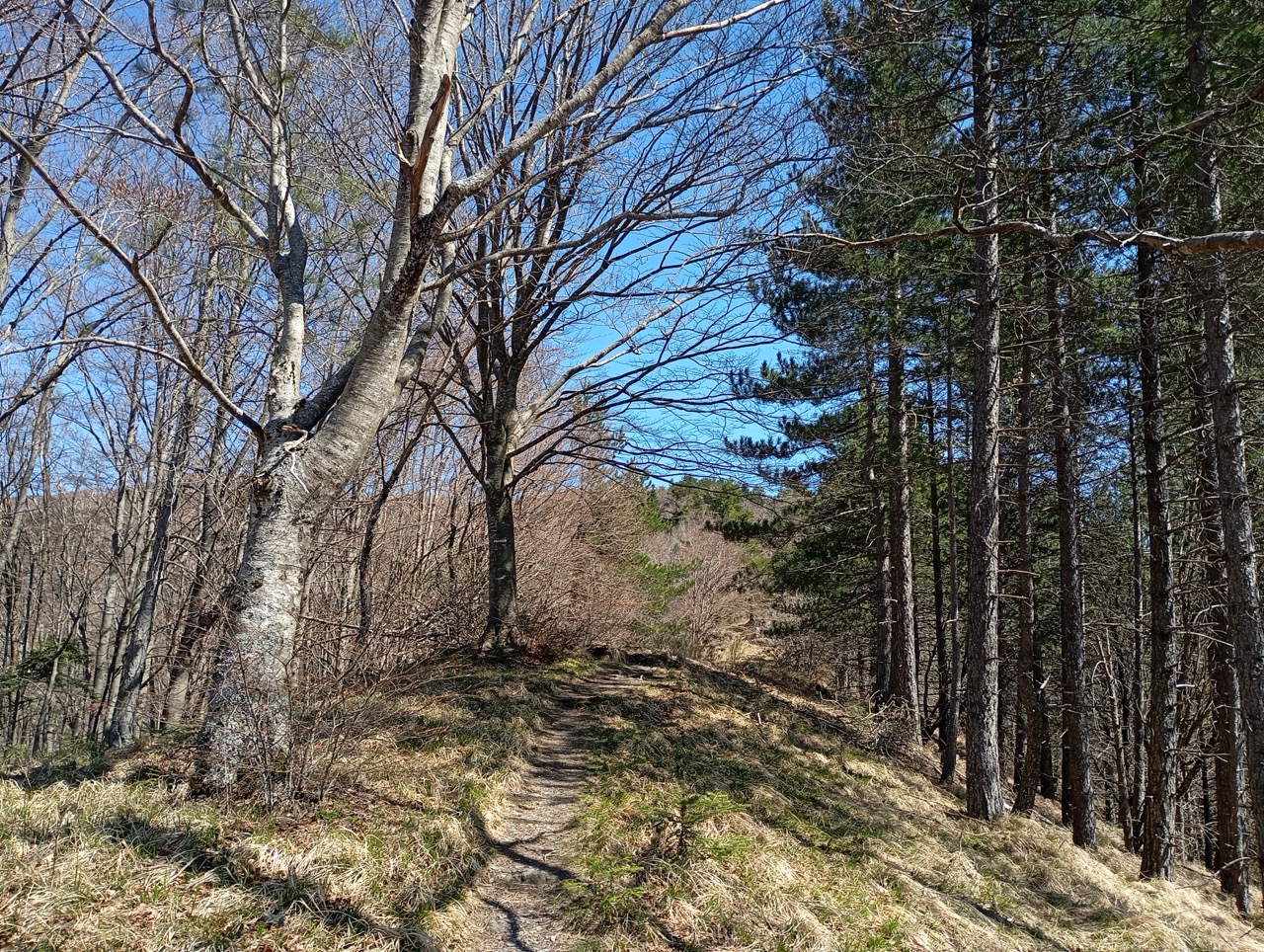 Il sentiero dopo un primo piccolo strappo si apre, tra pini neri e faggi, e prende una leggera piega a sinistra dove continua a salire, in maniera più dolce ma costante.