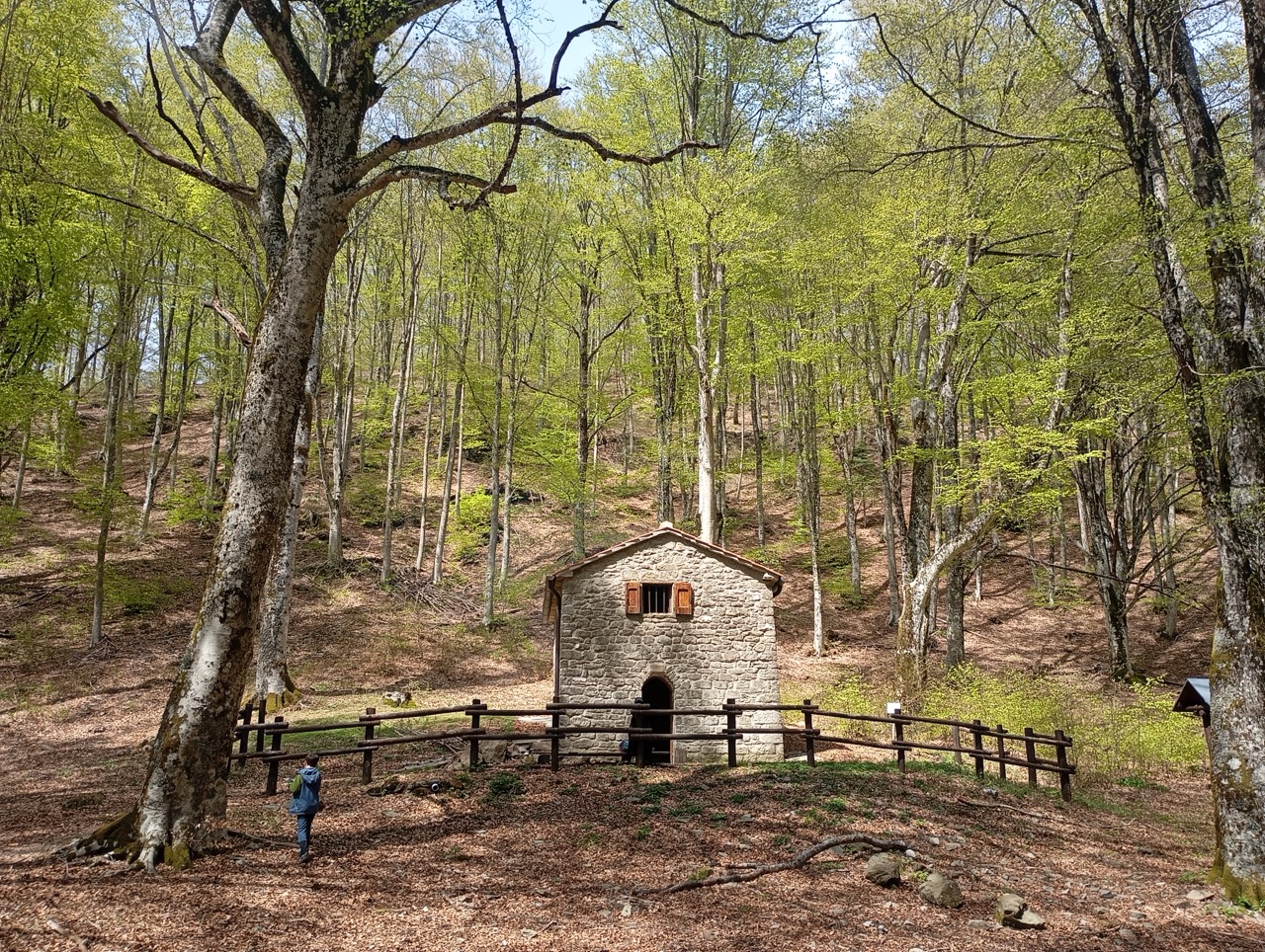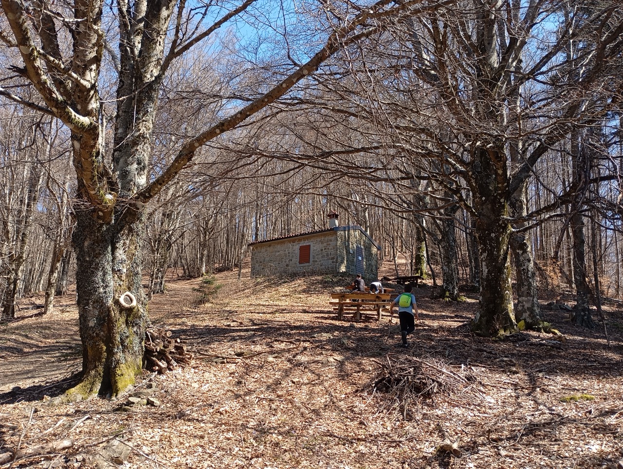 Si continua a salire fino a che non troviamo, immerse nella faggeta, le panchine e il Rifugio Bottigliana. E’ chiuso ma viene dato in uso contattando l’Unione dei Comuni del Pratomagno.