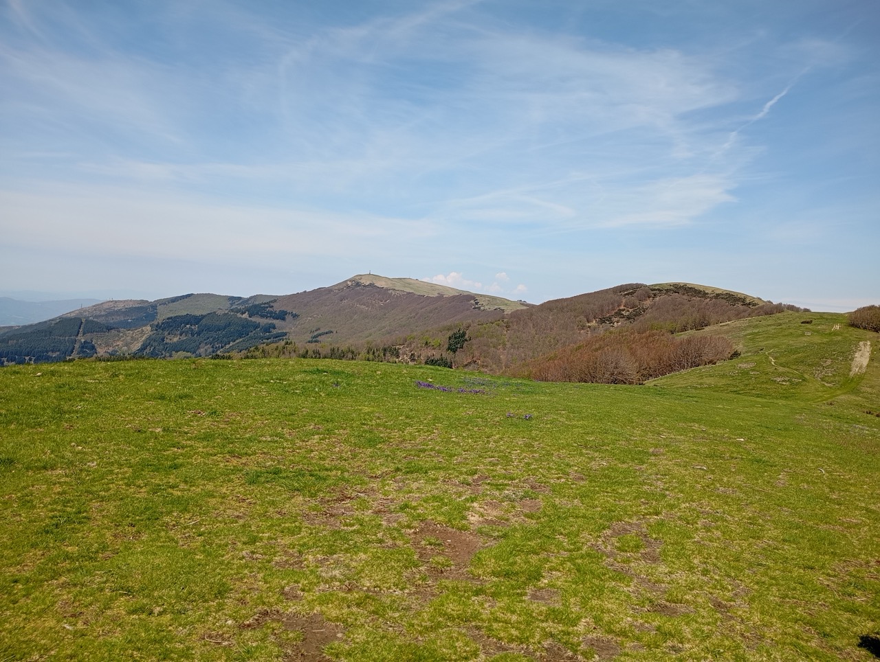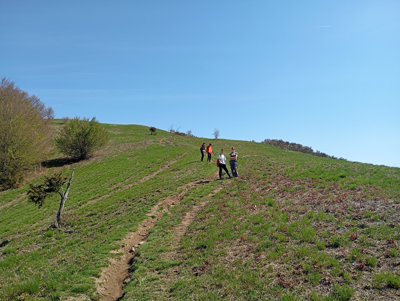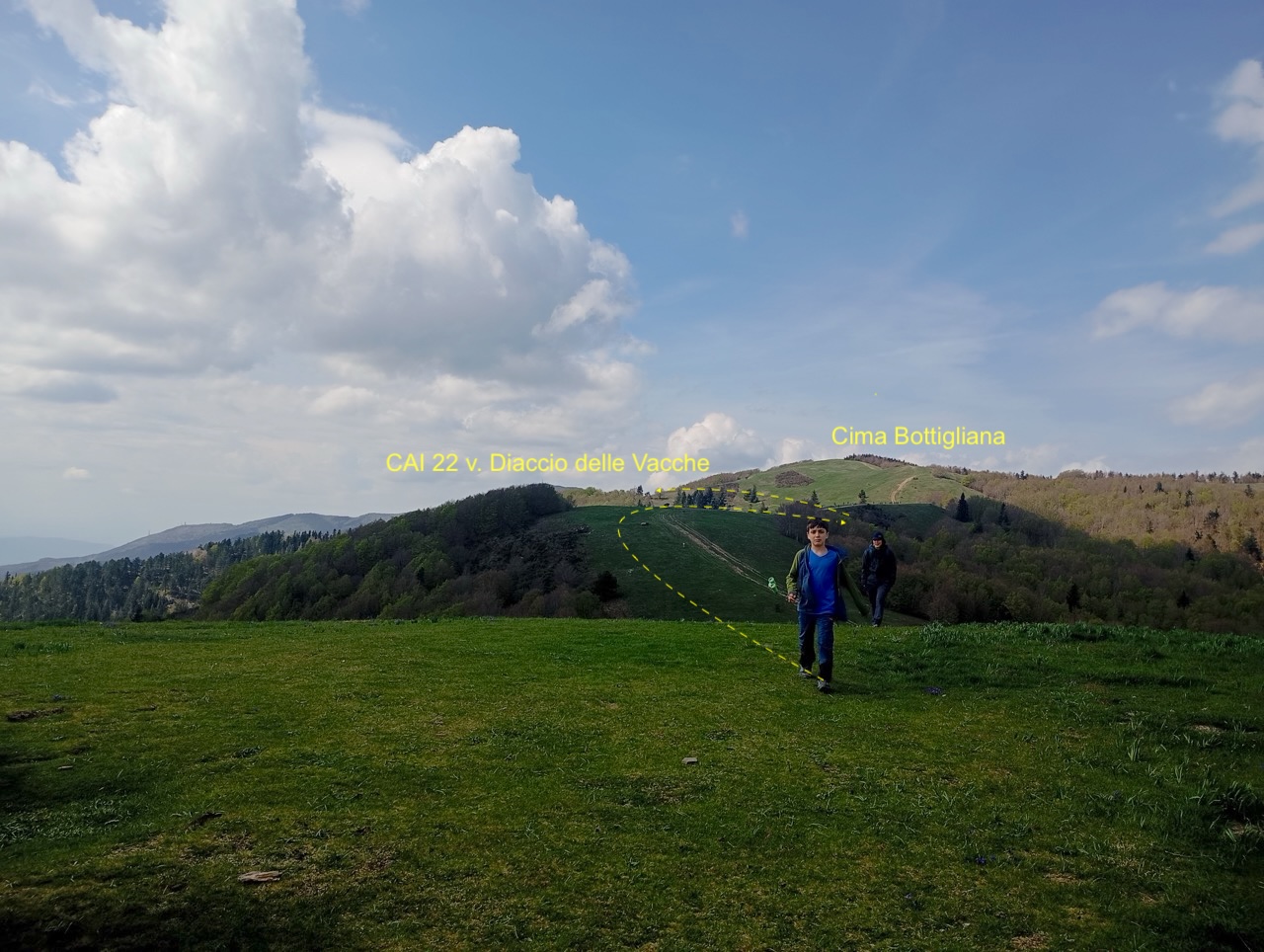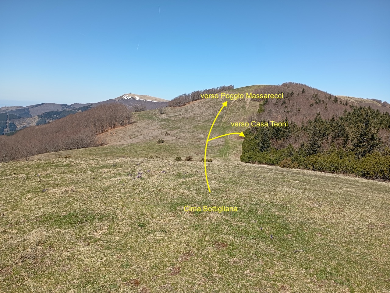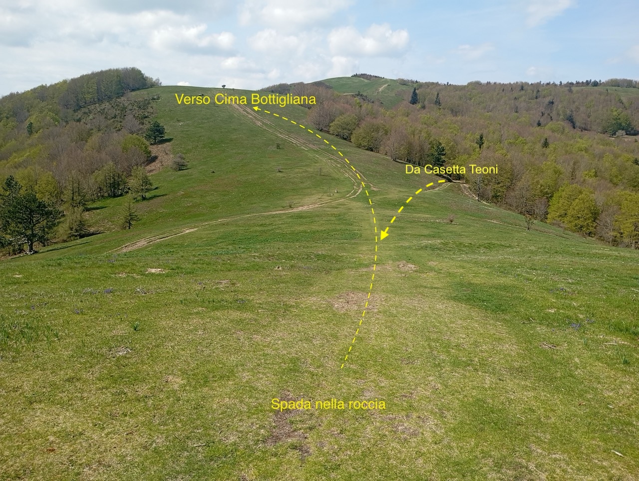 Dopo una pausa, si continua a salire fino a che il sentiero si apre, e dopo una curva a destra troviamo un bivio che prendiamo a sinistra per arrampicarci fino ai prati di crinale, presso Cima Bottigliana.