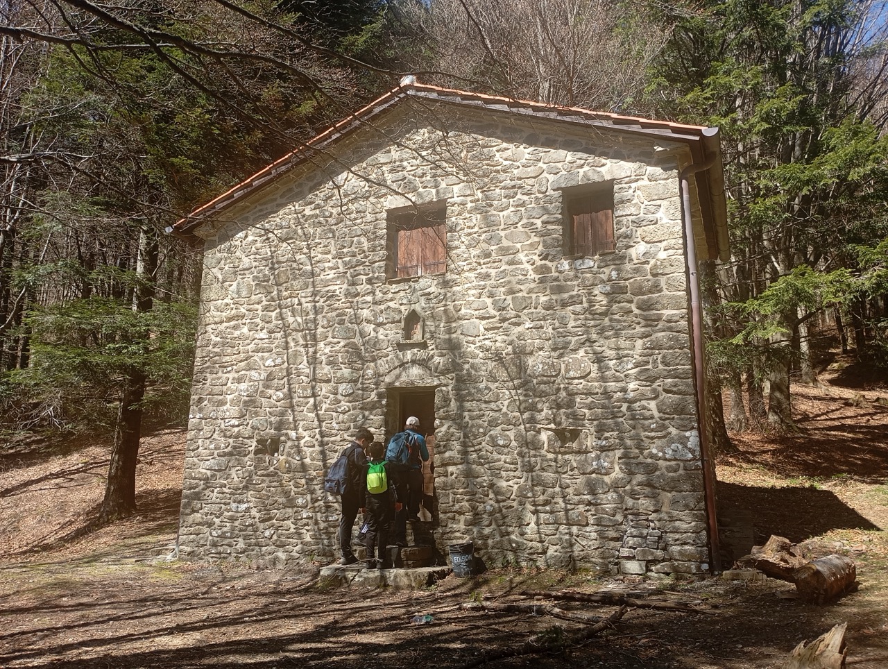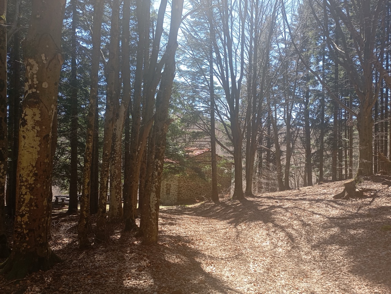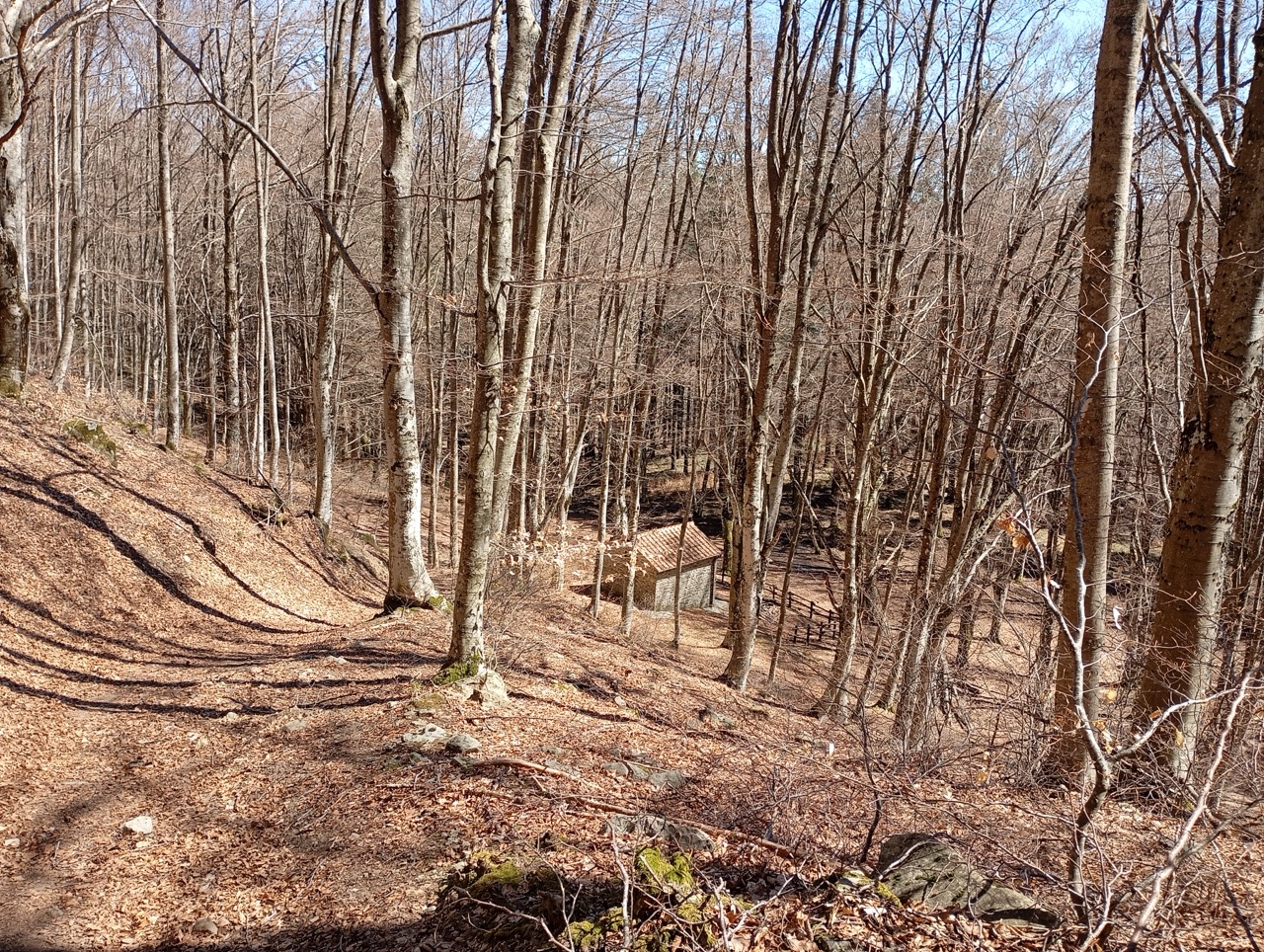 Dopo esserci concessi una ulteriore pausa, ritorniamo brevemente sui nostri passi verso Cima Bottigliana, per prendere la deviazione a sinistra che “entra” nel bosco verso Casina Teoni. Il sentiero, CAI 36, comincia a scendere e ci porta a giungere al Rifugio dall’alto. Il Rifugio è sempre aperto, e dispone di un camino e dei tavoli, e un soppalco per dormire,