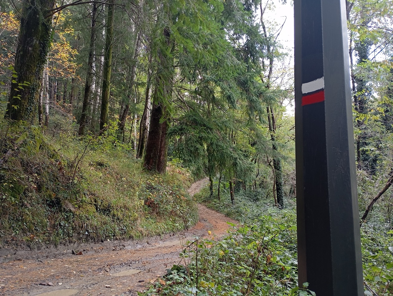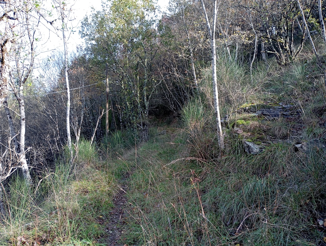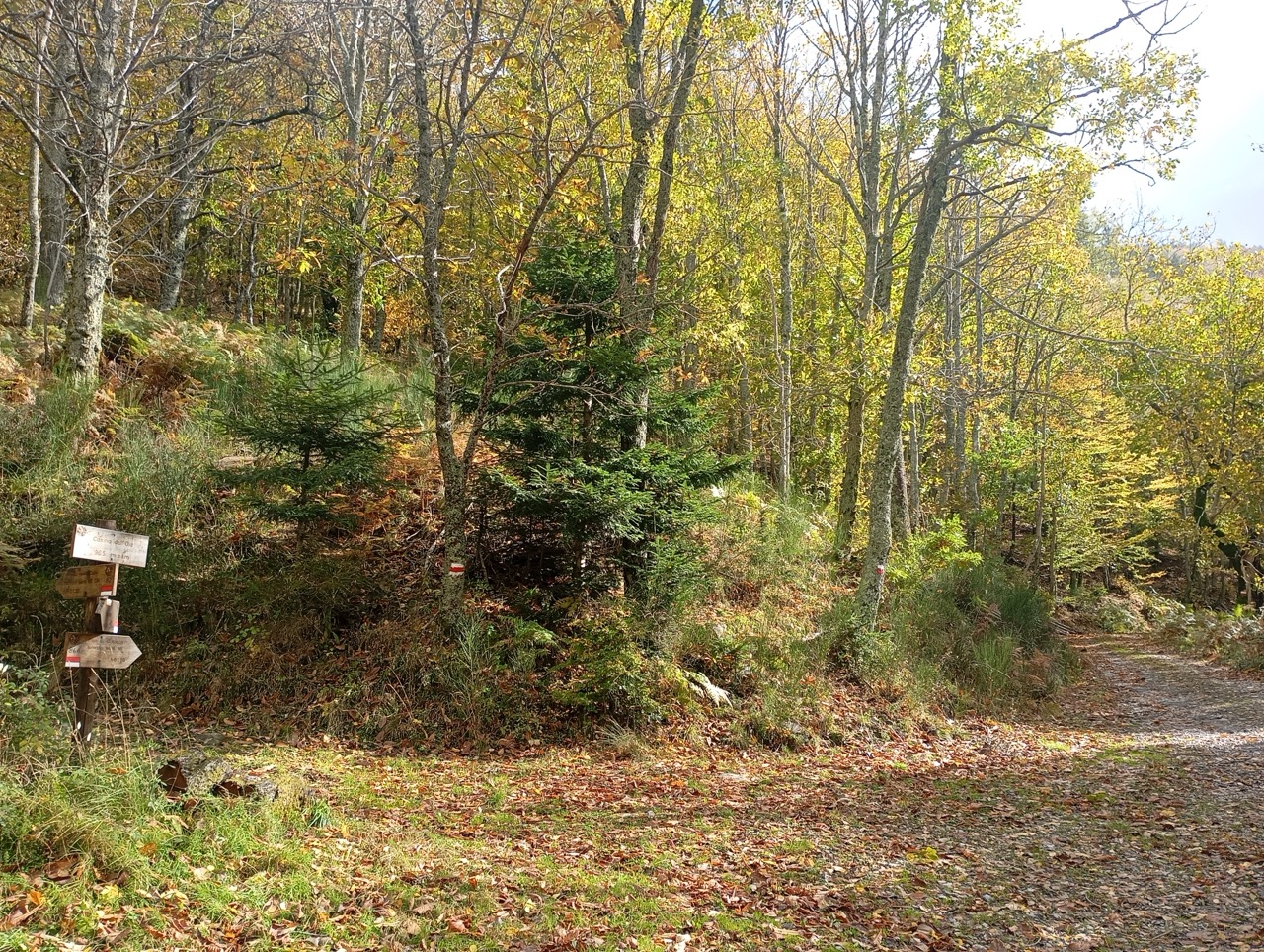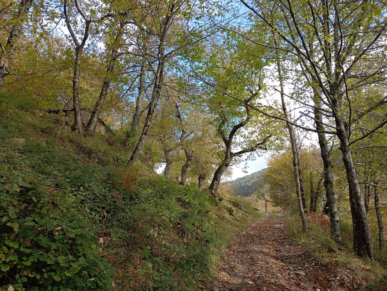 Una volta che siamo riusciti ad attraversare il torrente, il sentiero sale fino ad incrociare una strada forestale, che prendiamo a destra (sentiero CAI 90), attraversando dei castagneti da frutto con relativi seccatoi.