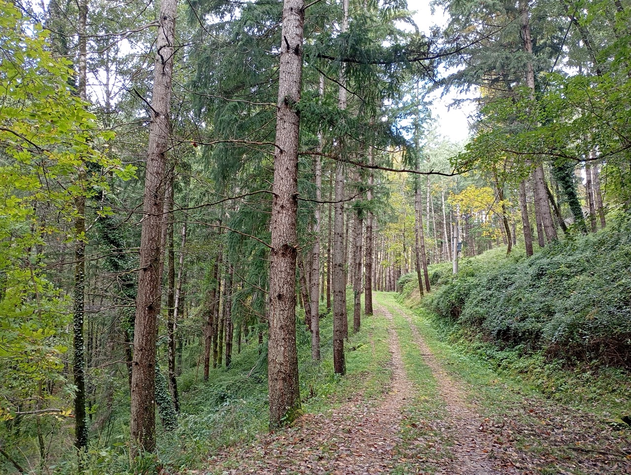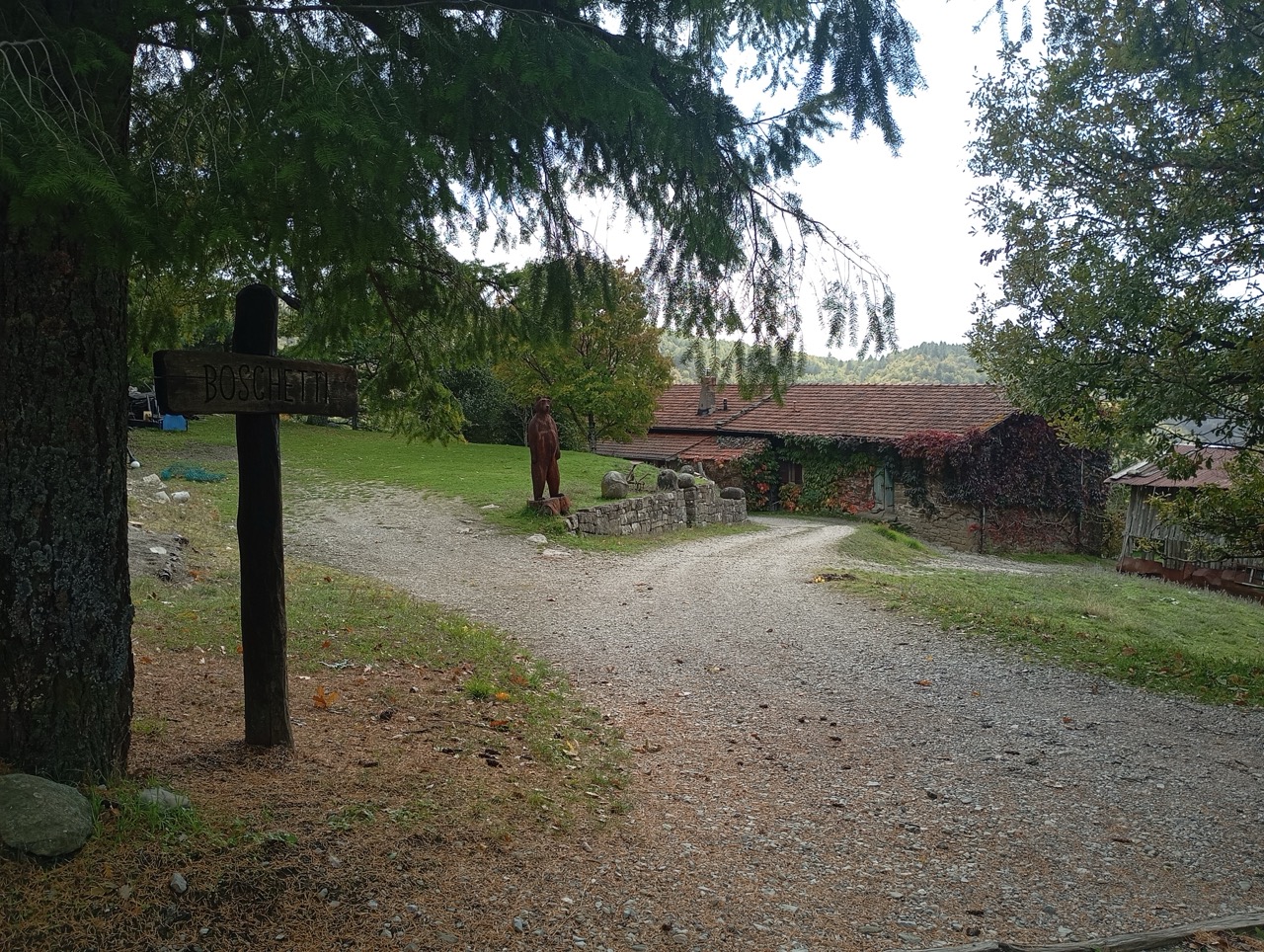 In discesa il sentiero e il bosco diventano più monotoni, ma oramai siamo arrivati verso le Case di C. Boschetti, dove è presente una statua di un orso in legno.