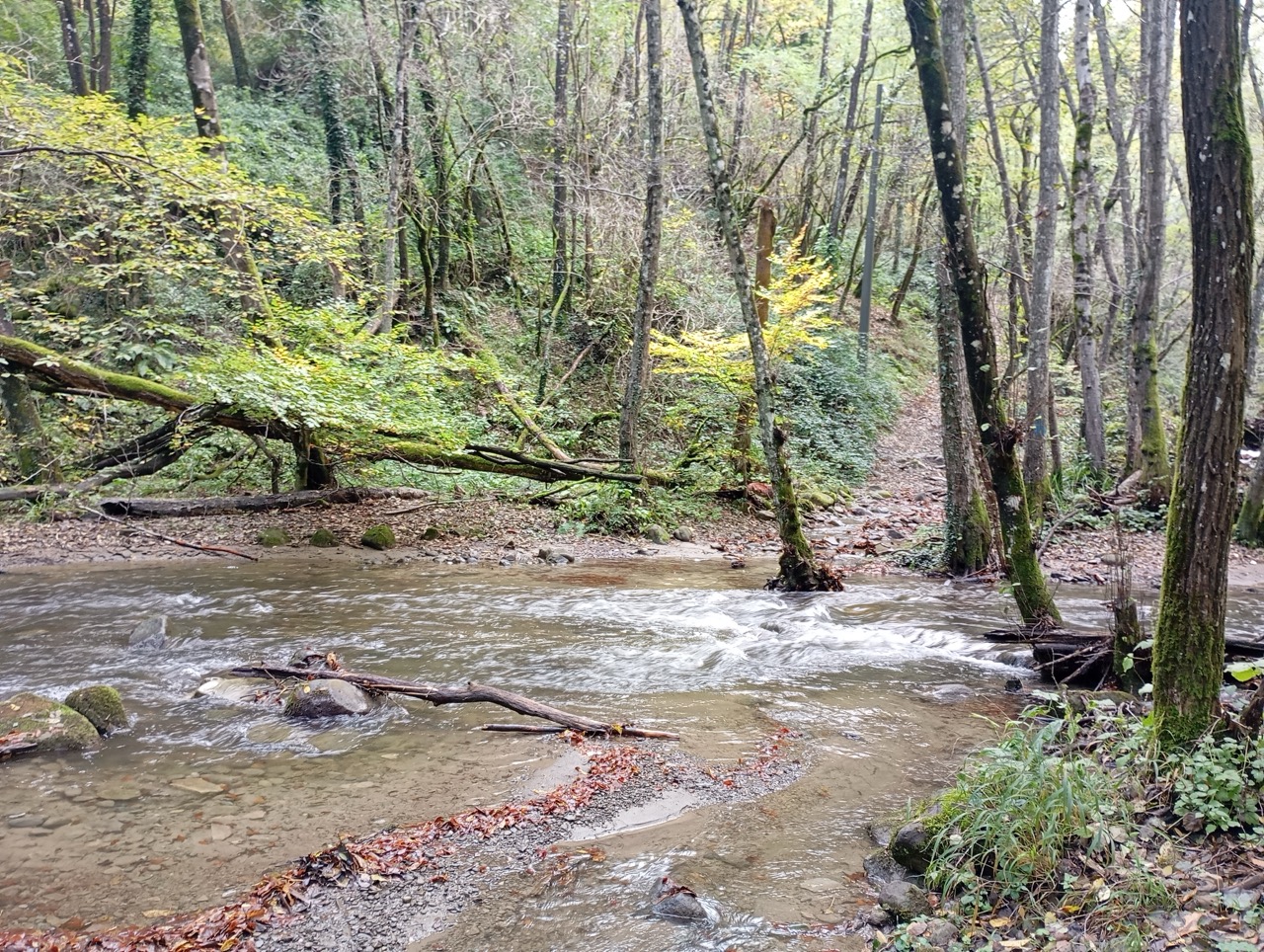 Da qui, anziché proseguire lungo il sentiero CAI, che prenderemo al ritorno, possiamo prendere un piacevole sentiero non segnato, che per circa 1 km costeggia sulla destra il torrente Oia, passando per un rudere, fino a incontrare una strada forestale, che seguiamo sulla sinistra.