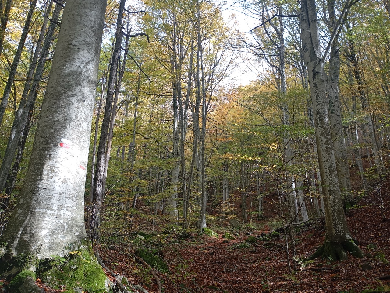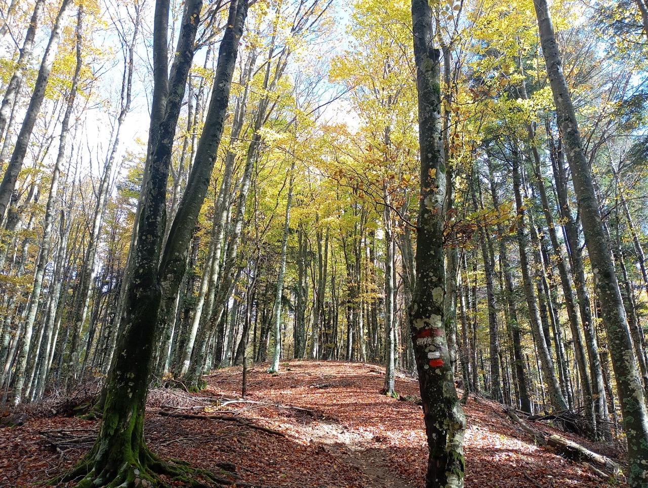 Continuiamo a salire in una splendida faggeta, fino a ritrovare la strada forestale, che prendiamo a destra verso M. Giogarello. Di qui seguiamo il sentiero CAI 86, che costeggia sulla destra le linee dell’alta tensione, seguendole fino a M. Tufone e poi oltre.